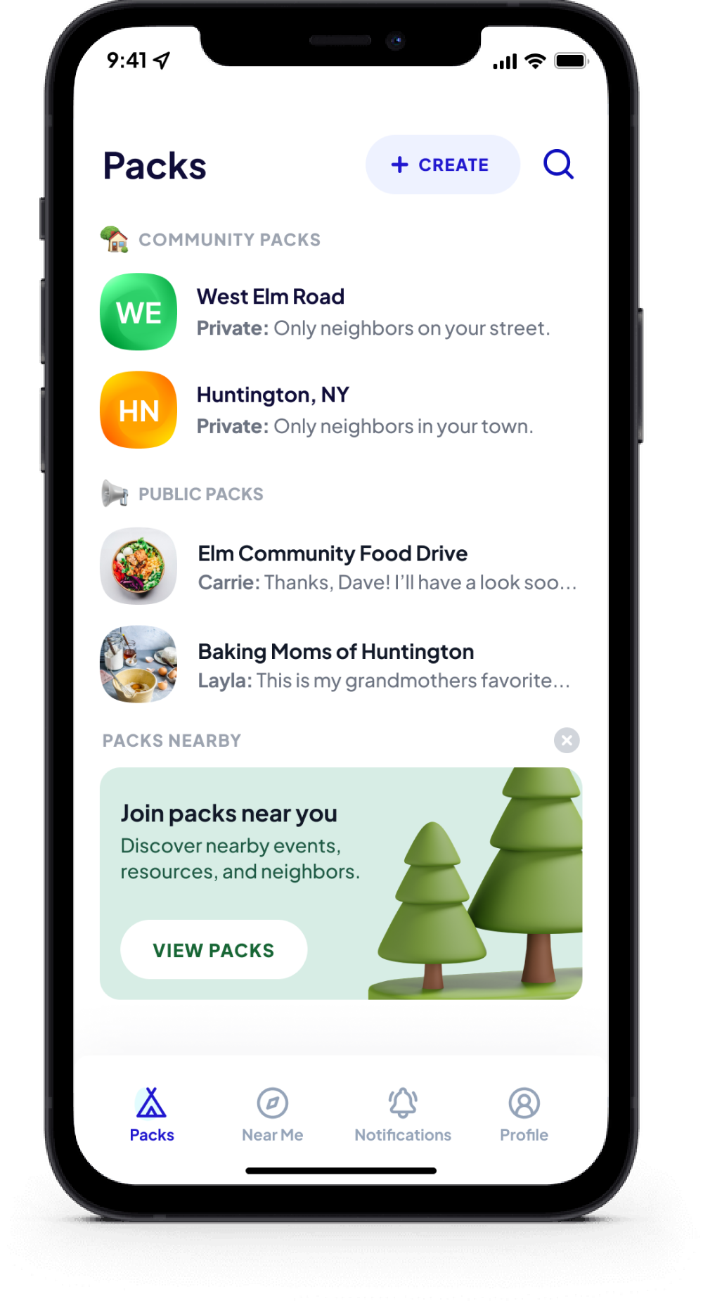 Packs are tailor made group chats that simplify connections with neighbors. We build a network for you. The only thing left to do is to make it your own. Want to start a walking club? Create a pack to find your people.